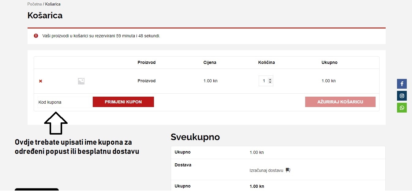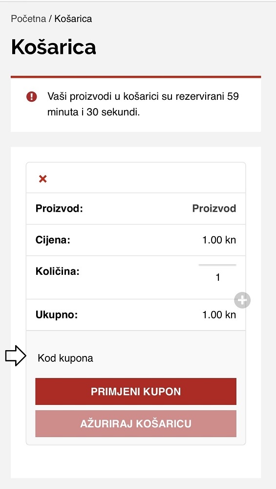Možete nastaviti dalje kupovati ili ukoliko ste završiti kupovinu idite na ” Košaricu “. Ukoliko imate kupon, na stranici ” Košarica “, unesite ga. Klikom na gumb ” Kreni na plaćanje ” prelazite na plaćanje.